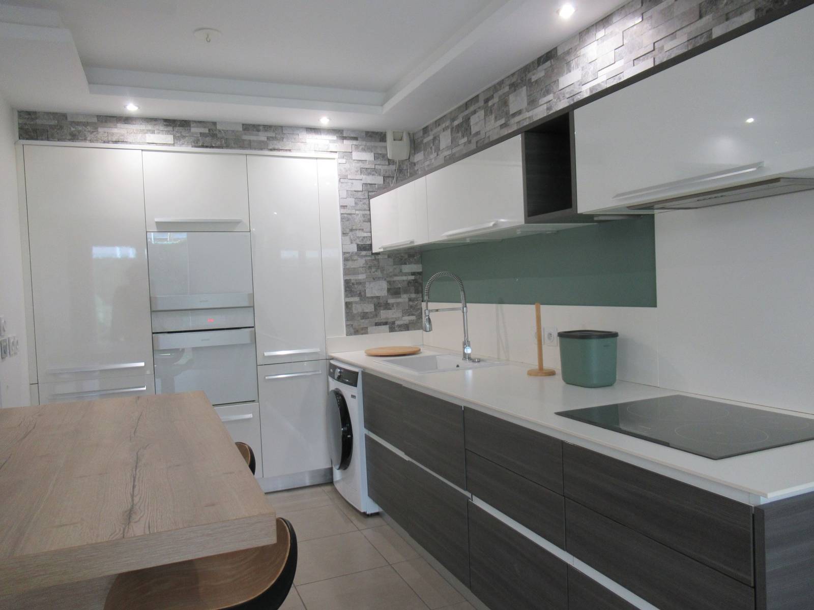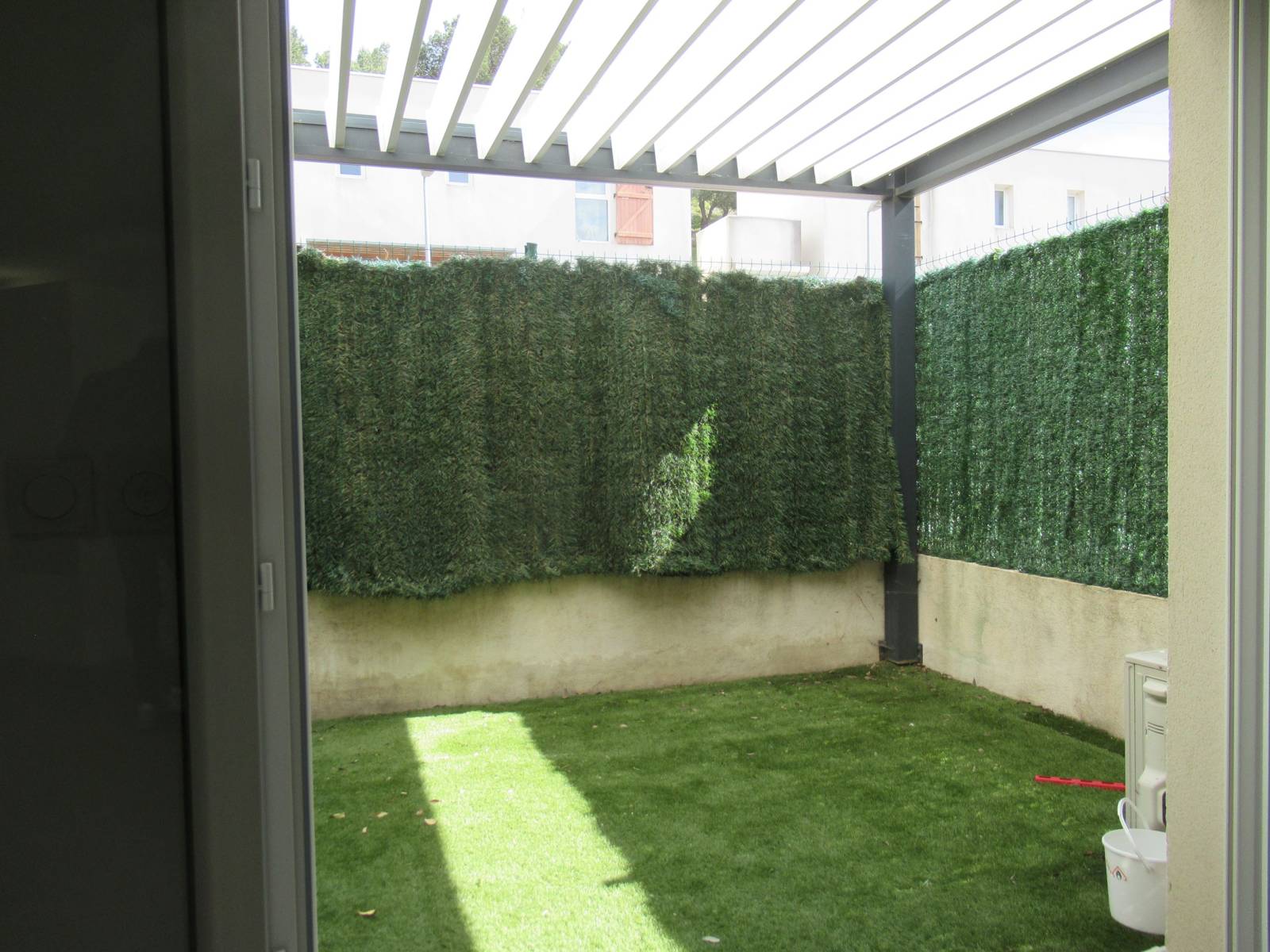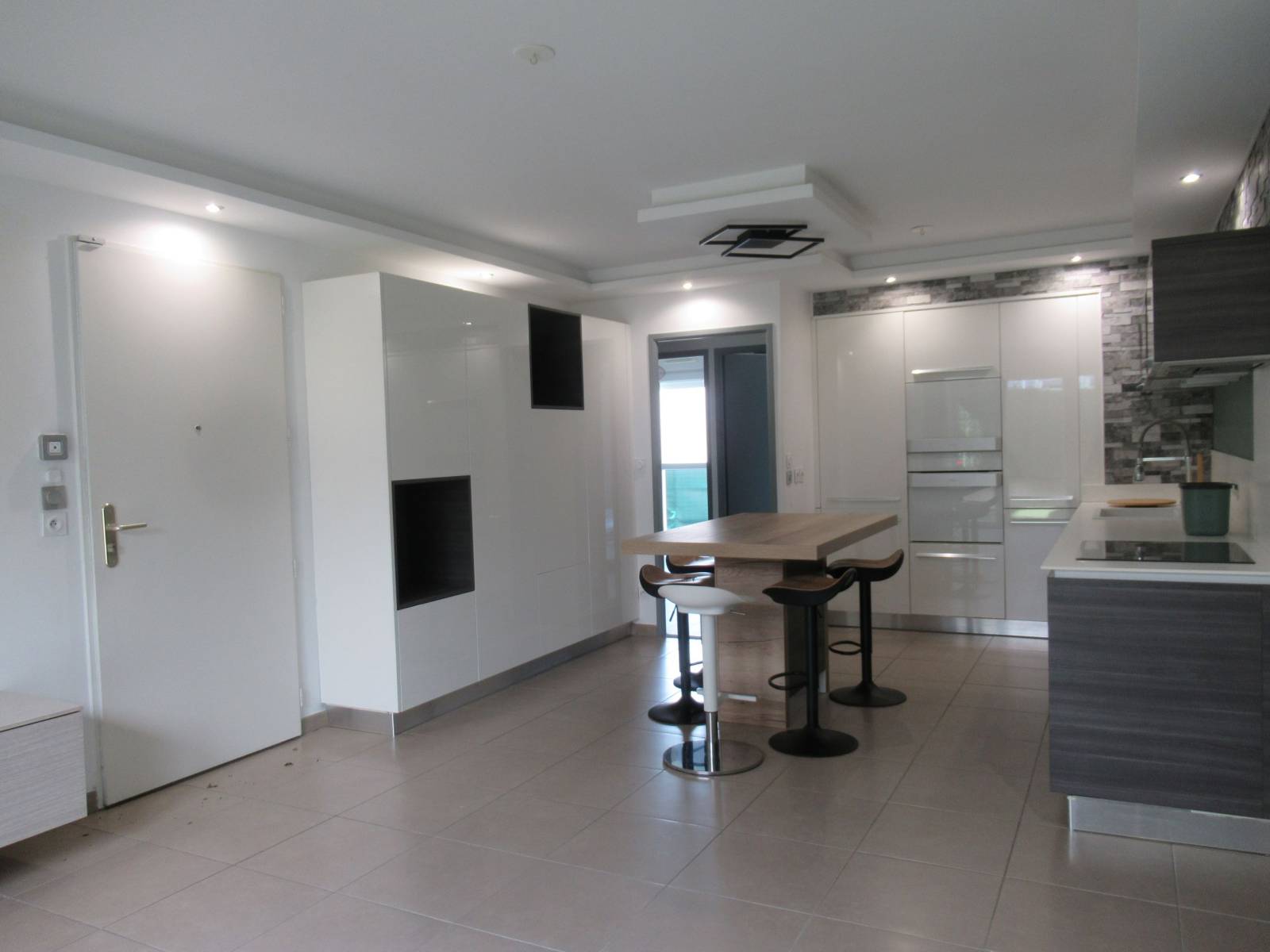 L’appartement s’ouvre sur un séjour lumineux avec cuisine ouverte entièrement équipée. Vous y trouverez un réfrigérateur, un lave-vaisselle, un lave-linge, un four, un four micro-ondes, une plaque de cuisson, une hotte et de nombreux rangements. Le salon donne directement accès à une terrasse agréable, couverte par une pergola bioclimatique électrique, idéale pour profiter de l’extérieur tout au long de l’année.