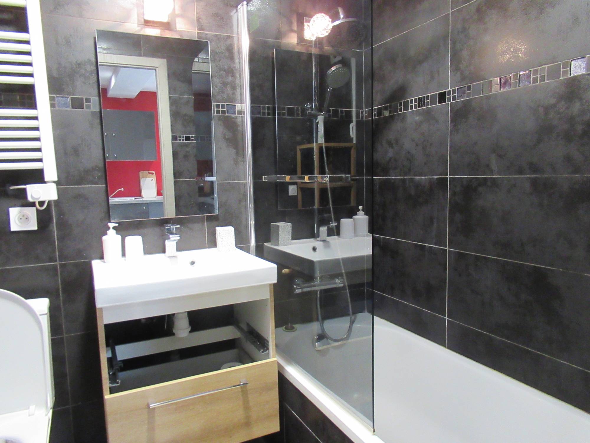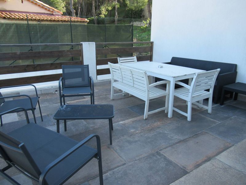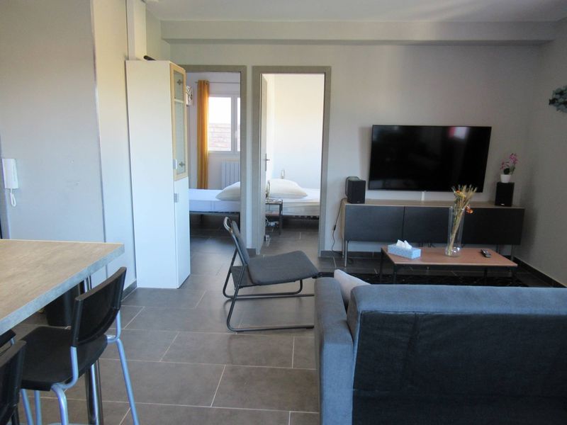 L'appartement se distingue par ses prestations modernes et son agencement optimisé. Il comprend un séjour lumineux avec une cuisine ouverte, entièrement équipée, offrant un espace convivial idéal pour les moments en famille ou entre amis. Cette pièce de vie donne directement sur une spacieuse terrasse aménagée avec un abri de jardin, permettant de profiter pleinement des beaux jours.