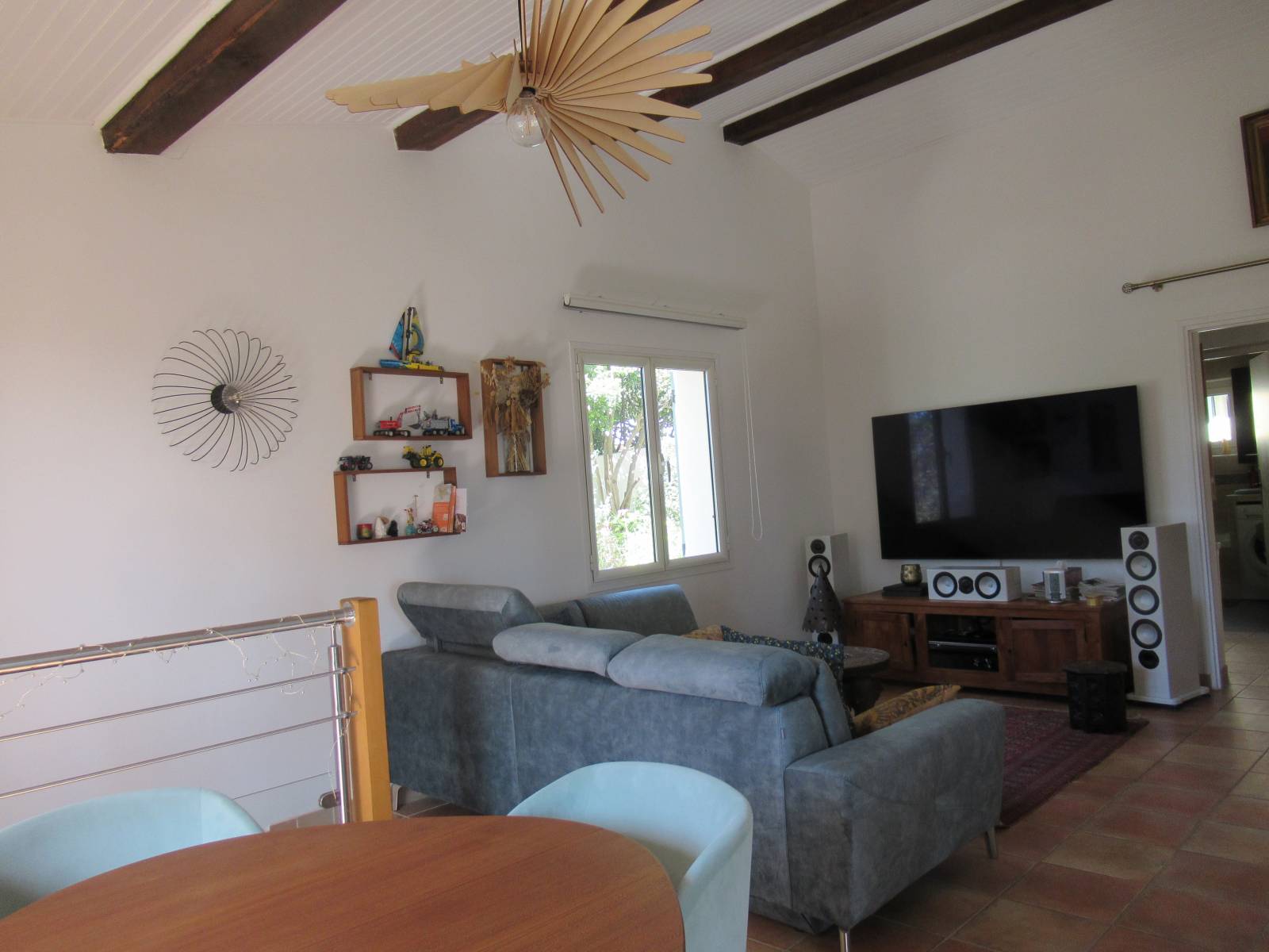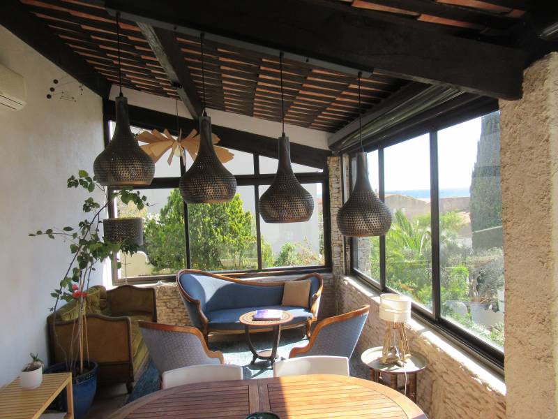Un séjour lumineux prolongé par une véranda climatisée avec vue mer.