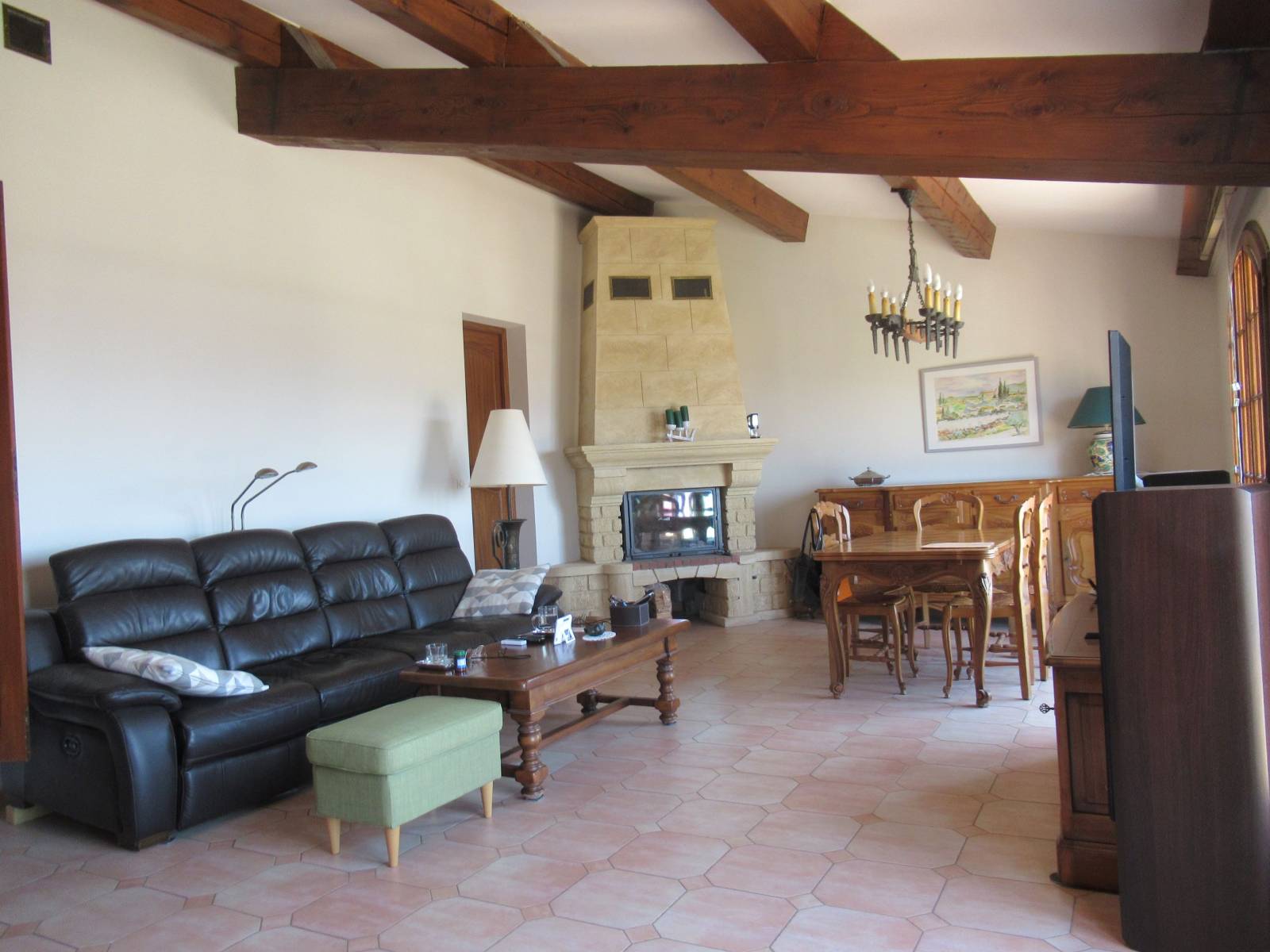 Vous accèderez ensuite à un bel espace salon / salle à manger avec cheminée, et une superbe vue mer.