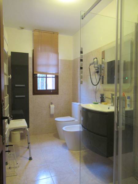 Une chambre en rez de chaussée avec placards de rangement, une salle d'eau complète, WC, un cellier.
