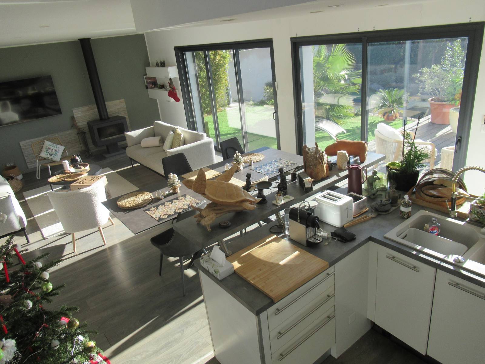 La cuisine équipée est ouverte donnant sur le séjour vous permettant de profiter de la vie familiale en cuisinant. Le salon est doté d'un poele à bois.